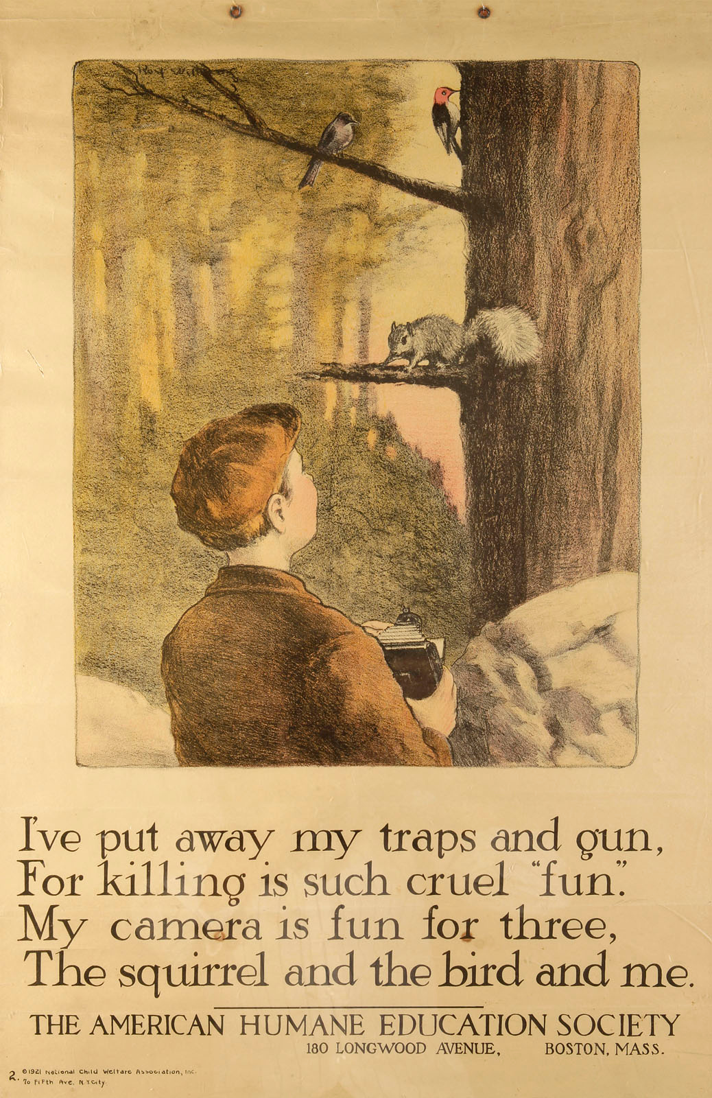 Humane Education encouraged children to use a camera instead of “traps and gun” when encountering animals as is the case in this poster produced by the American Humane Education Society c.1921. This theme of using photography to learn about other species was prominent throughout Humane Education efforts in the late 19th- and early 20th- centuries. For example, in Flora Helm Krause’s 1910 publication entitled Manual of Moral and Humane Education one of the discussion questions around the theme of “Nature Study” for 8th graders was: “The kodak can accomplish more in science than the gun.”