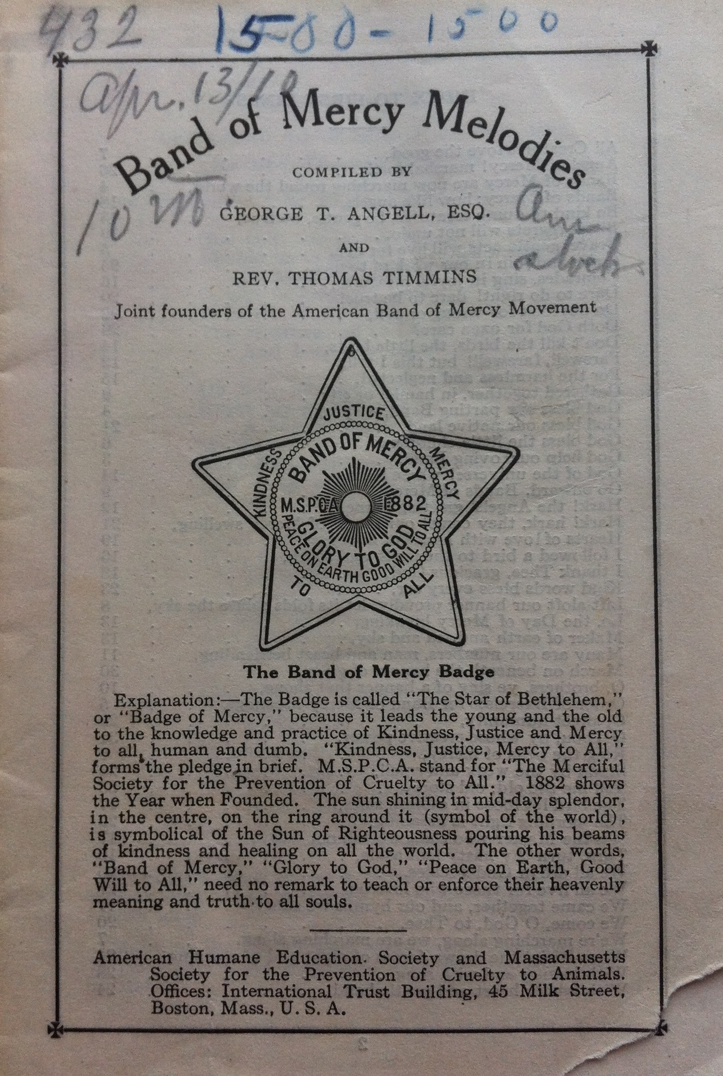 This songbook was originally compiled by George T. Angell and Reverend Thomas Timmins, the two men who brought the Band of Mercy movement to the United States in 1882. The copy of the songbook in this exhibit dates to 1910, a testament to the popularity of this publication. Band of Mercy Melodies was published by the American Humane Education Society (AHES) and the Massachusetts Society for the Prevention of Cruelty to Animals (MSPCA).