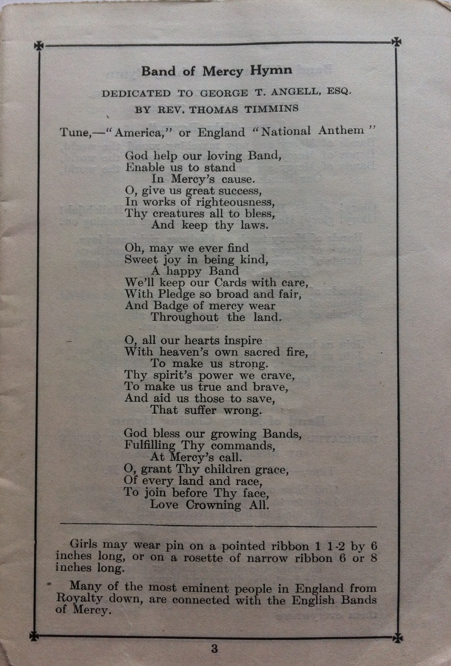 Within the pages of Band of Mercy Melodies are the lyrics to several songs that were meant to be sung by children at Band of Mercy meetings. The musical scores are not provided in this publication, however, there are frequently suggestions as to which tune the song should be sung to. In the example above, the “Band of Mercy Hymn” was meant to be sung to the tune “America” or to the tune of the English National Anthem.