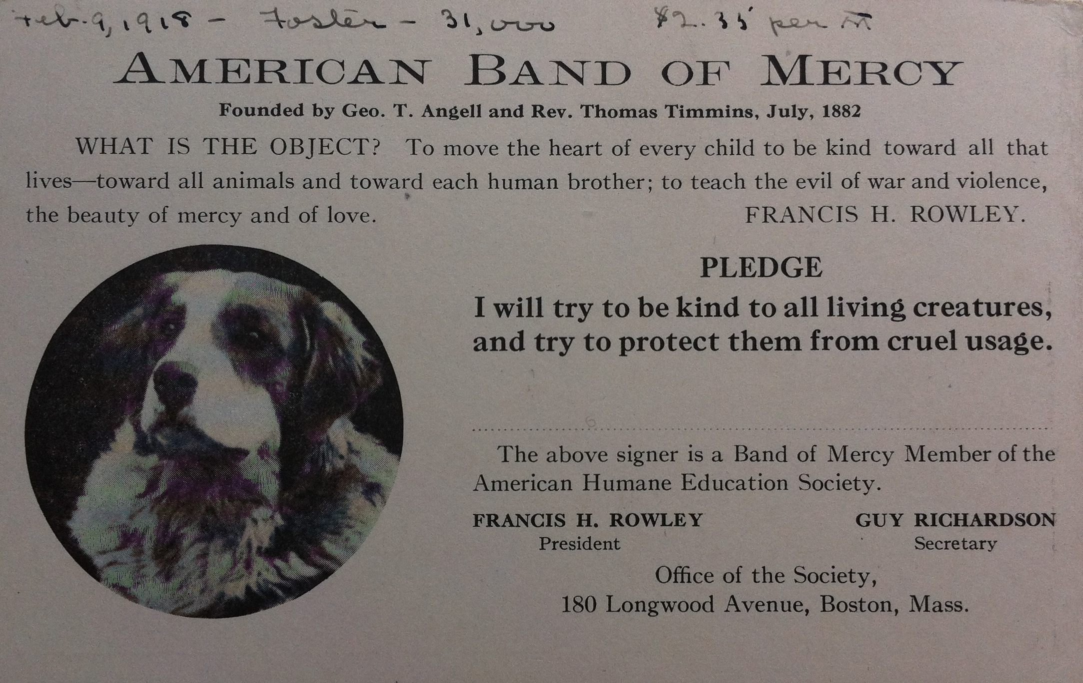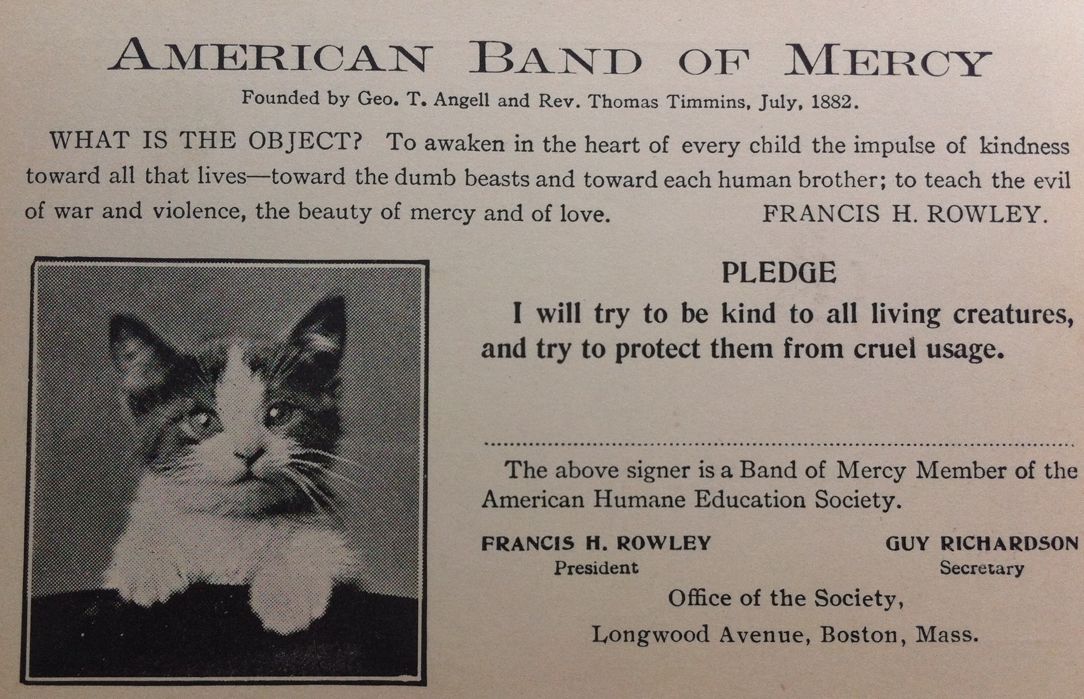 The front of the card explained the object of the American Band of Mercy (“to awaken in the heart of every child the impulse of kindness toward all that lives”), reprinted the pledge that each member took, and offered basic information about the Band of Mercy movement in the United States.