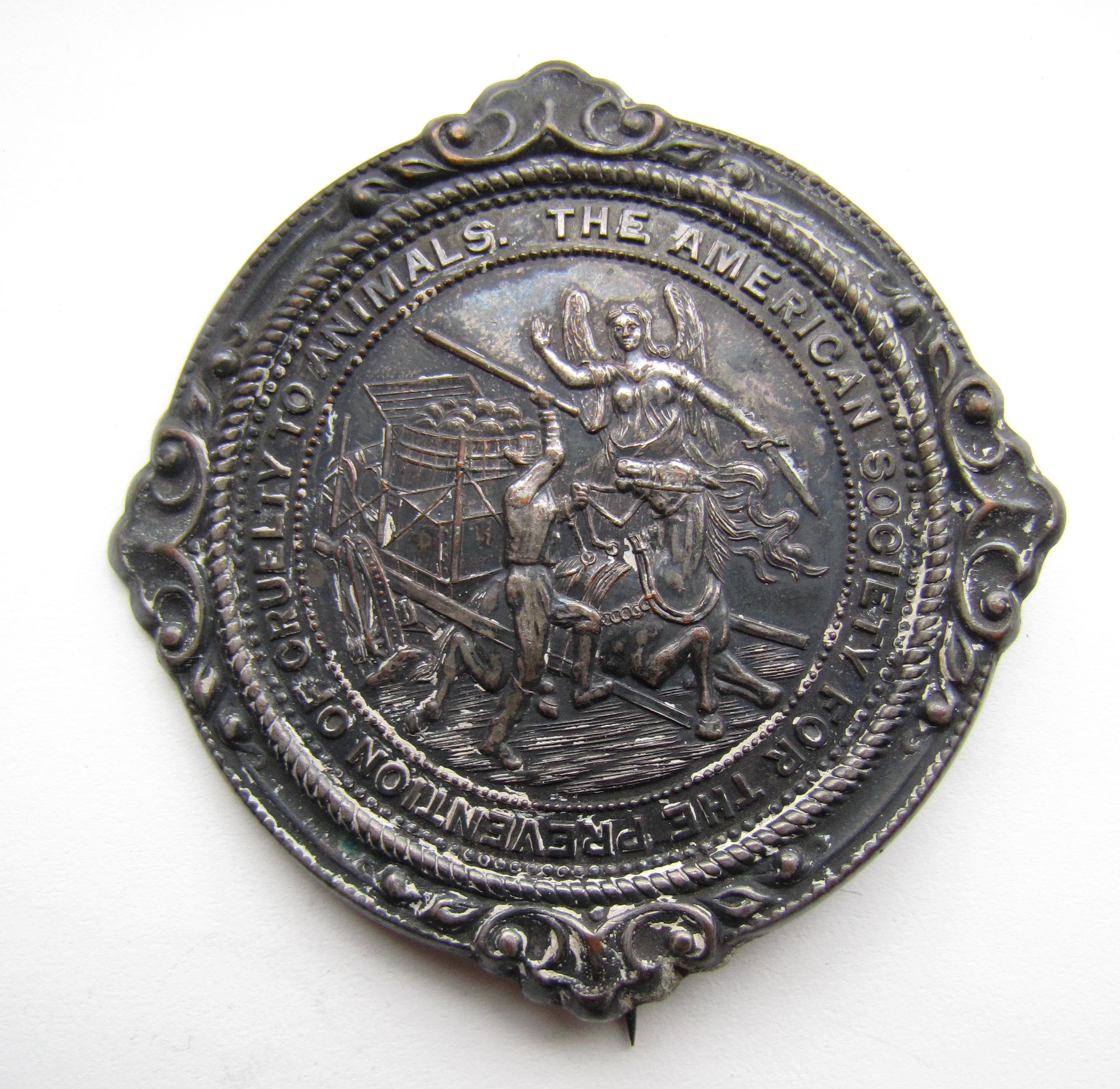The American Society for the Prevention of Cruelty to Animals (ASPCA) was founded by Henry Bergh in 1866. This ASPCA pin features the “Angel of Mercy,” a figure that would become an important part of the iconography of animal advocacy during the late 19th- and early 20th-centuries. In this example the Angel of Mercy halts the actions of a man who is beating his horse. The scene unfolding is one of extreme heartlessness–the horse has collapsed due sheer exhaustion from pulling an overloaded cart, but instead of coming to the aid of the horse, the driver of the cart begins to use a stick in order to force the terrified and tired horse on.