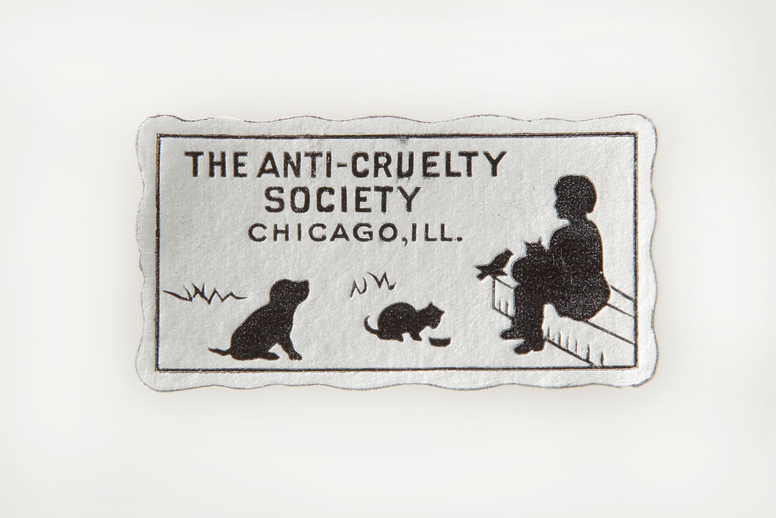 This label produced by the Anti-Cruelty Society is striking in its monochromatic design. The silhouetted figures of the child, the birds, the cats, and dog sit in stark contrast to the white background and, as such, would have been a strong visual symbol of affinity with the Society’s goals and aims by those who used it.