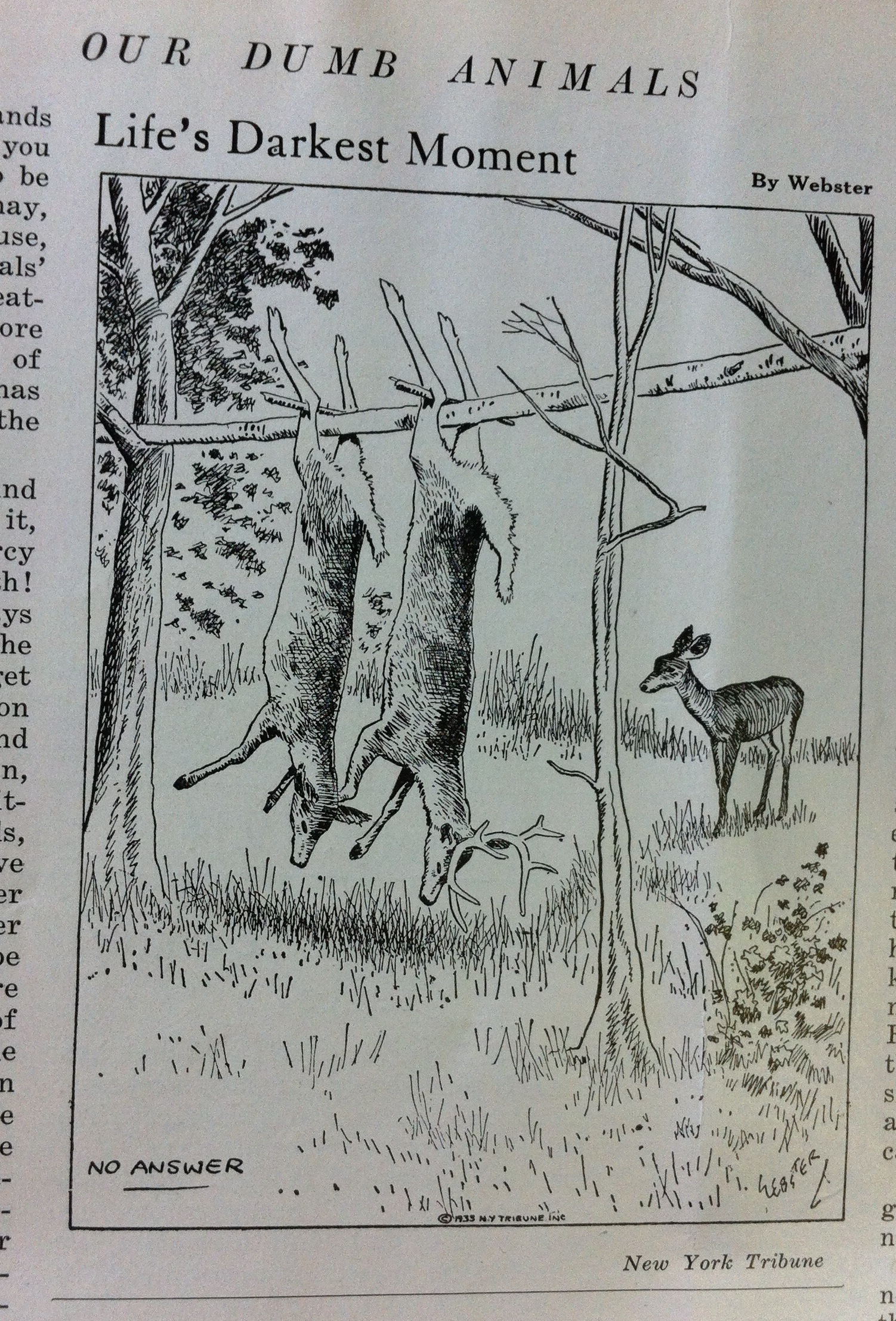This haunting cartoon was originally published in the New York Tribune, and was reproduced in Our Dumb Animals in January 1934. In this image a young fawn comes across the horrifying scene of two adult deer–perhaps her parents–who have been killed by hunters. The simple phrase “No Answer” added to the bottom of the image is intended to create an empathetic response in the viewer, a recognition that nonhuman animals, like us, possess emotional bonds with one another.