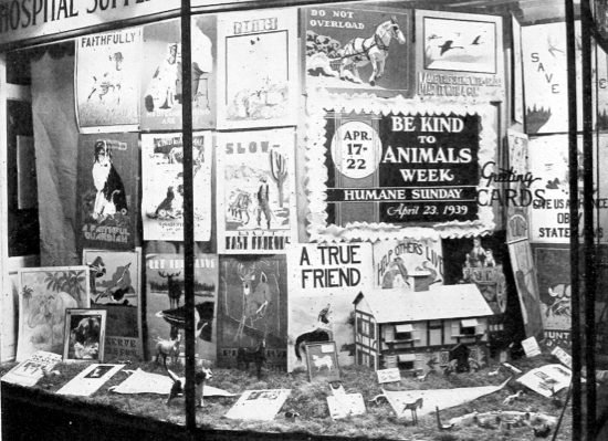 This photograph shows the front windows of a pharmacy in Hyannis, Massachusetts decked out for Be Kind to Animals Week® in 1939. In addition to colourful posters advocating for everything from compliance with State laws and awareness not to overburden the loads of horses, many of these posters underscored the bonds between humans and nonhuman animals. “A TRUE FRIEND,” one poster of a dog proclaims, “A FAITHFUL GUARDIAN,” states another. At the bottom of the display are framed images, pennants, and small figurines of various animals.