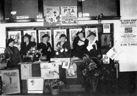 This is a photograph taken of a Humane Education display in Tennessee c.1935. Six women pose at the booth which has a placard with the words “HUMANE EDUCATION” right in the centre. As this photograph shows, it was often women who took a primary role in advocating for Humane Education at this time.