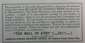 The American Humane Education Society made the film available for sale and for rent, and it was, by all accounts, very popular and played to full houses around the United States. The AHES also made the film available for audiences in other countries–the advertisement below mentions that The Bell of Atri was to be “translated into Norwegian and widely exhibited.” The AHES continually marketed the film, but gave it special attention in the months leading up to Be Kind to Animals Week® each year.