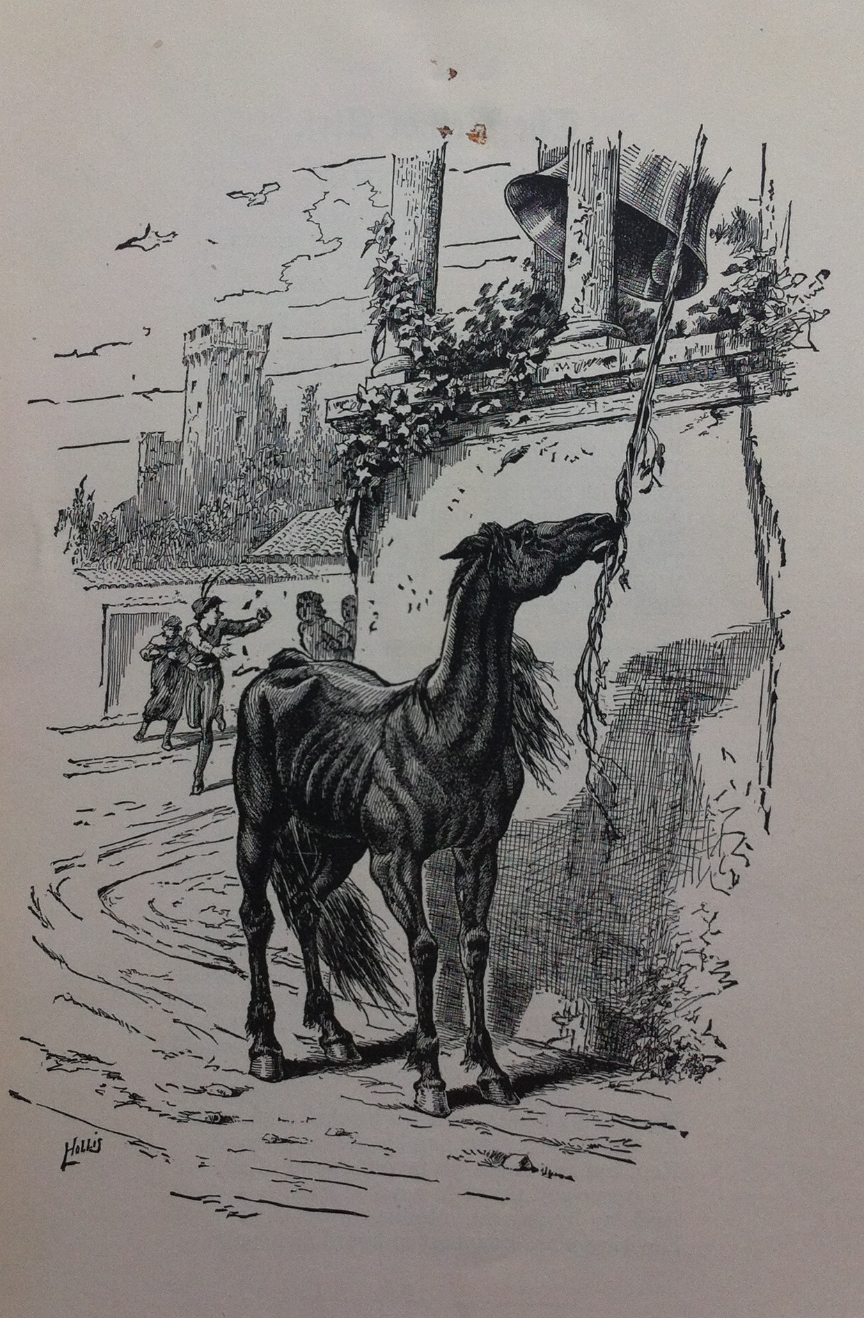 Longfellow’s poem tells the tale of a abandoned horse who had the eventual good fortune to be living in a village that had a rather unique approach to community justice. In this village a centrally-placed bell which was to be rung when an injustice occurred. The sounding of the bell, according to Longfellow’s tale, gathered villagers together in order to help settle the dispute. In his search for food, the hungry horse in the poem began nibbling on the rope attached to the bell, and in so doing sent the signal to the villagers that an injustice was taking place. The injustice in this case, of course, was the plight of the once-loved horse who was turned out to fend for himself. The “noisy crowd” that gathered at the site of the bell witnessed the Knight who had once proudly ridden this very same horse ordered to “comfort his old age, and to provide Shelter in stall, an food and field beside.”